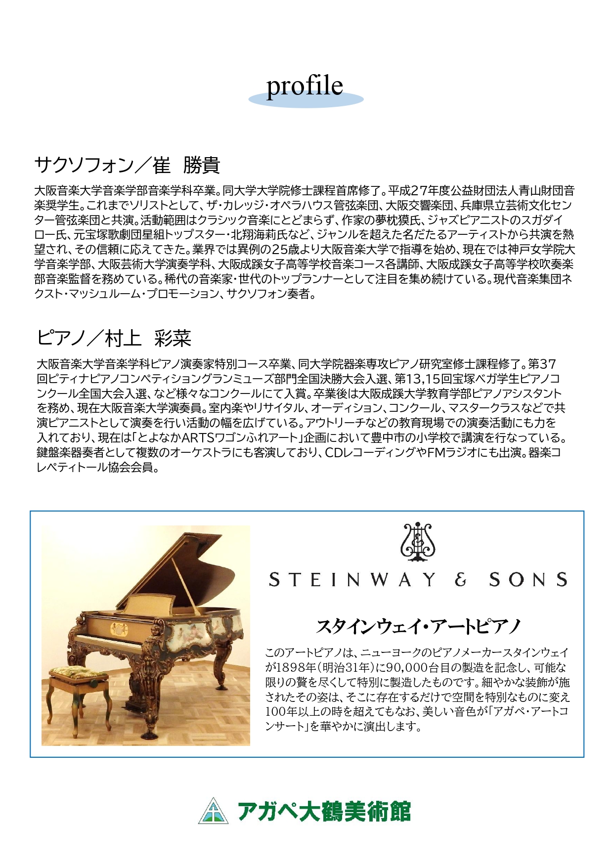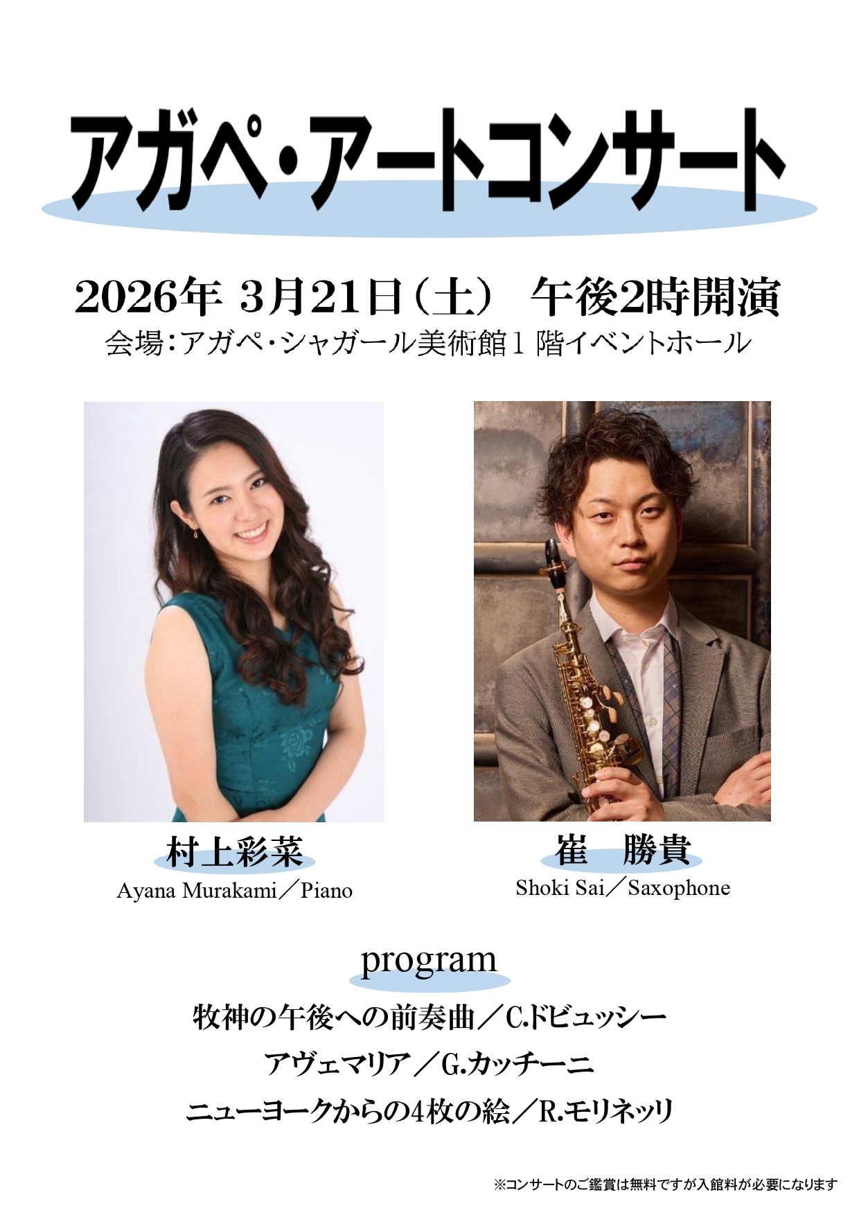 アガペ・シャガール美術館1階イベントホールにて、「アガペ・アートコンサート」を開催致します🎵